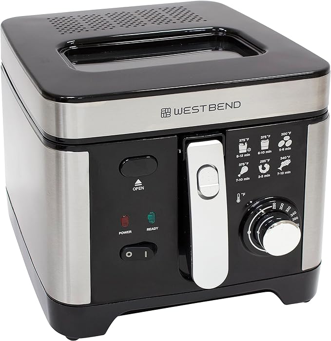 West Bend Deep Fryer with Adjustable Temperature Control Nonstick Basket Easy-View Window and Temperature Guide, Folding Handle and Locking Cover for Easy Storage, 3-Liter, Silver -