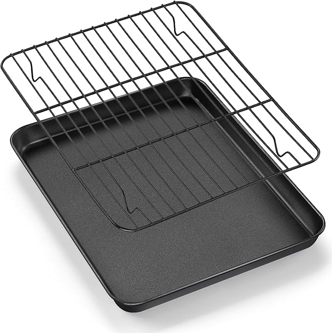 E-far Nonstick Baking Sheet with Rack Set, 9 x 7 x 1 Inch Cookie Sheet Baking Pan with Cooling Rack for Toaster Oven, Commercial Grade & Non-Toxic, Easy to Clean -