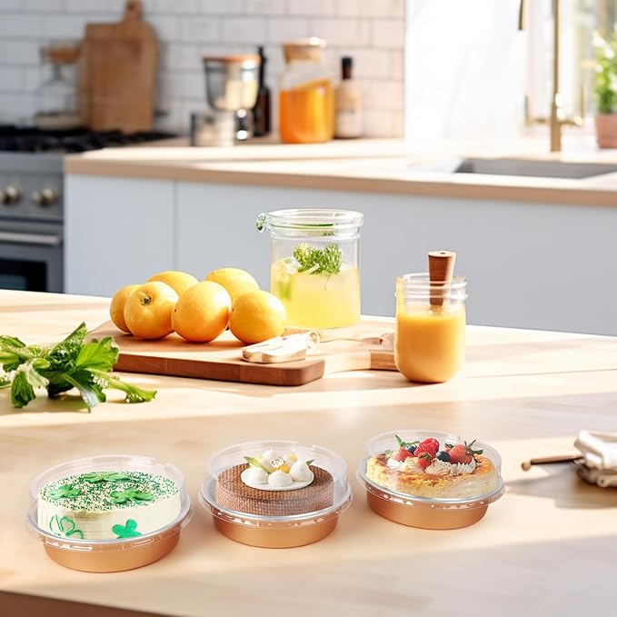 Beasea Mini Ramekins with Lids, 120 Pack 4 Inch 8oz Disposable Creme Brulee Tart Pie Tins Rose Gold Small Aluminum Foil Cake Baking Tins Pans Individual Round Containers Oven Safe for Baking -