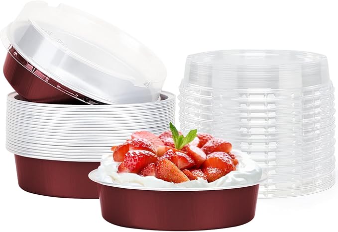 Beasea Disposable Mini Pie Tins with Lids, 20 Pack 4” 7.3oz 215ml Small Round Aluminum Baking Tart Foil Container for Individual Dessert Cupcake Cheesecake Ramekin Quiche Oven Dishes - Wine Red -