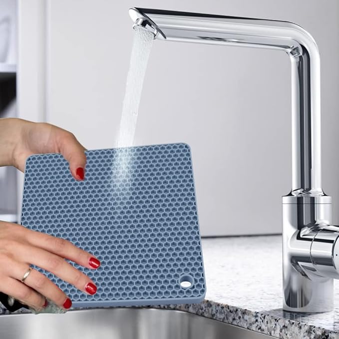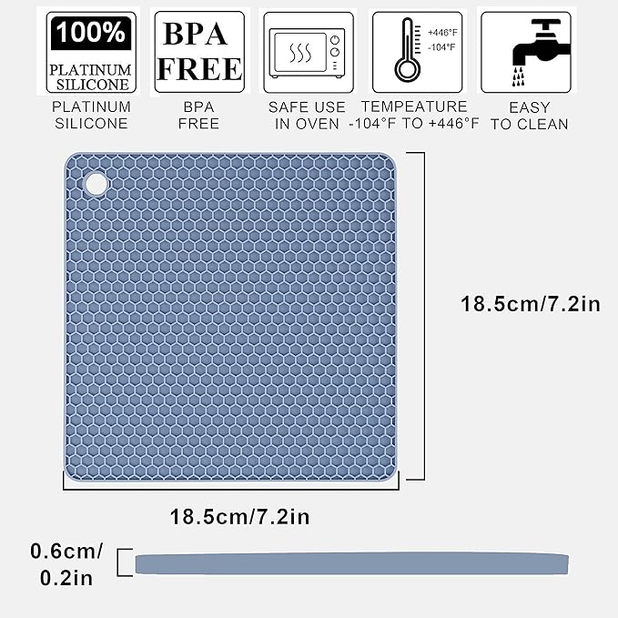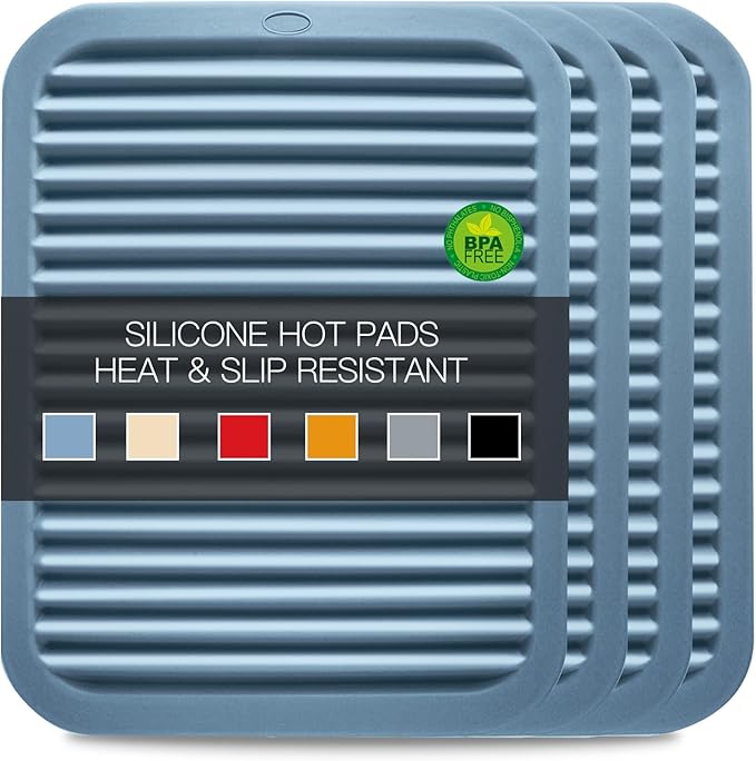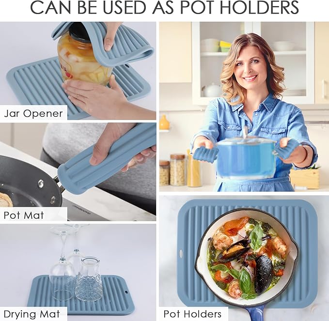 4 Pack Silicone Trivet Mat, Silicone Trivets for Hot Pots and Pans, Non-Slip & Heat Resistant Silicone Hot Pad for Kitchen Counter Mat Set, Soft Drying Mat, Jar Opener and Coasters, Square, Blue -