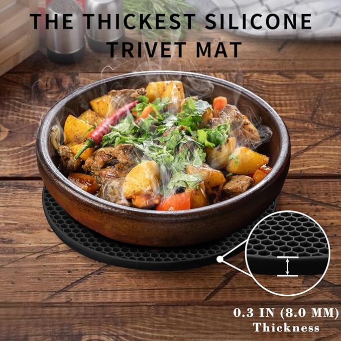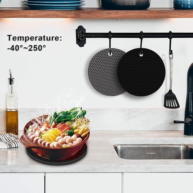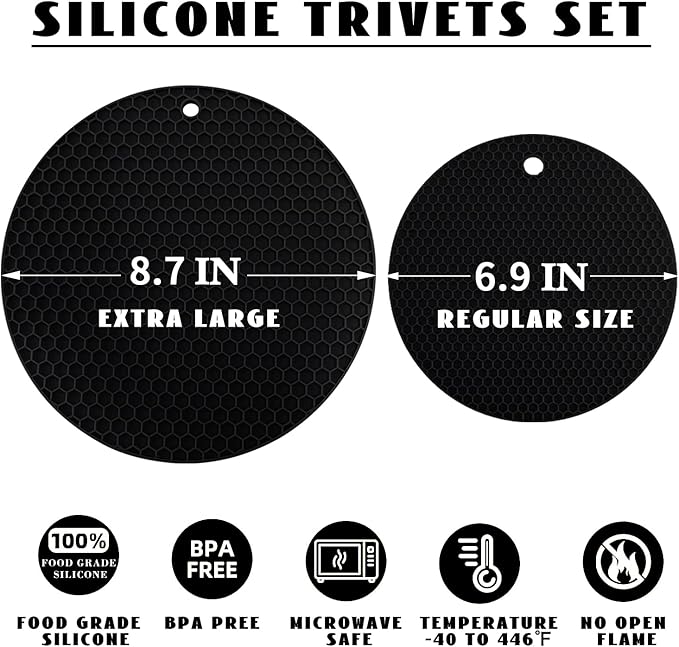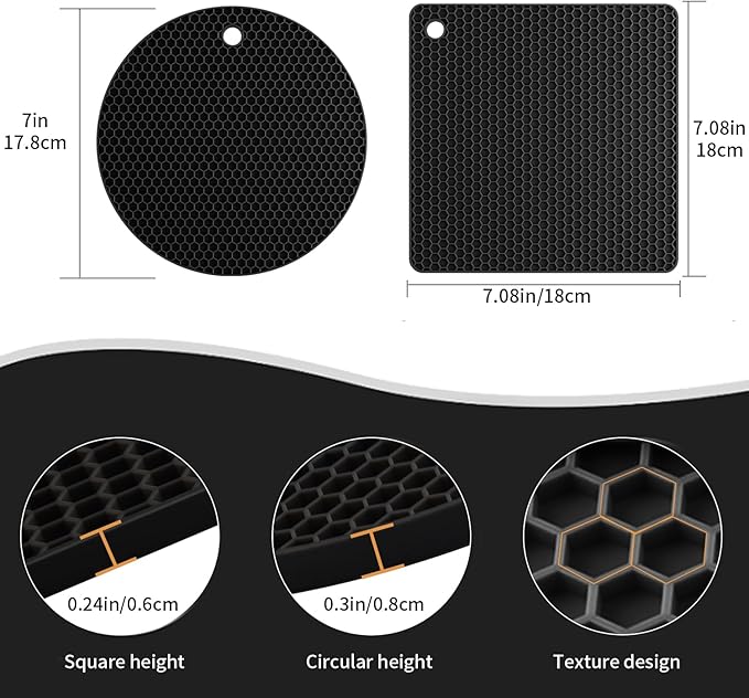 4 Pack Silicone Trivet Mats, 7 Inch & 9 Inch Flexible Heat Resistant Silicone Hot Pads Pot Holders for Kitchen Counter, Round Trivets for Hot Dishes - Potholders Jar Opener(Black) -