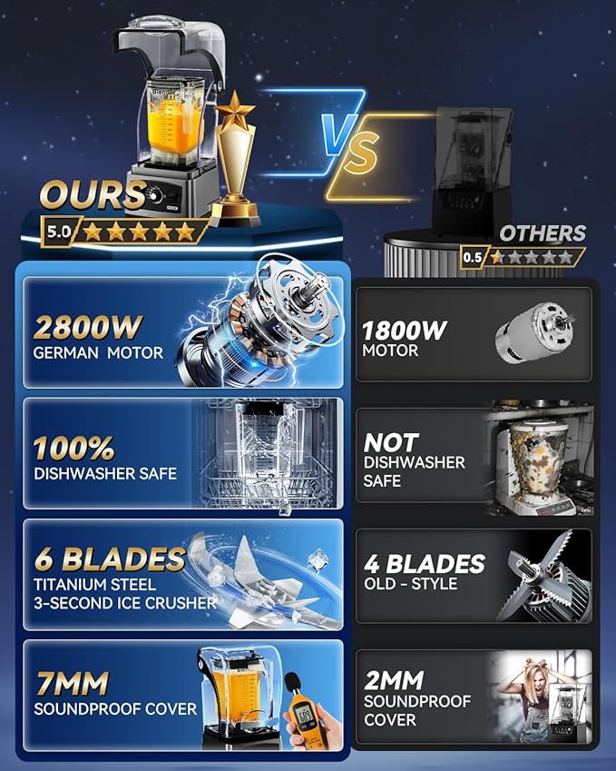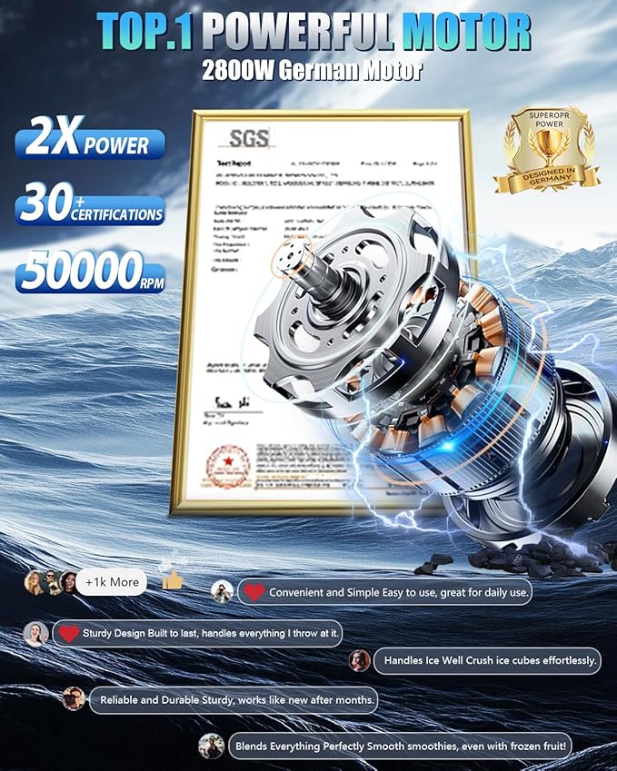2025 Upgrade Commercial Blender | SGS German Super Motor 2800W| Dishwasher Safe | 6-Piece Japanese Blades, 3-Second Quick Ice Crushing |Quiet Blender for Juices and Smoothies -