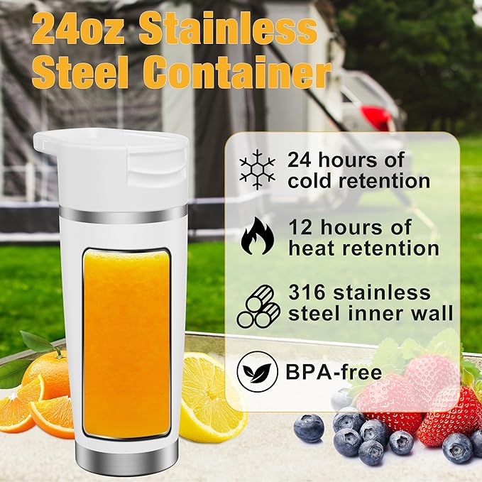 Portable Personal Blender 24oz Vacuum Cup Cordless Blender for 120 Watt Rechargeable Personal Size blender With Stainless Steel Bottle Ideal For-Shakes and Smoothies, BPA Free (White) -