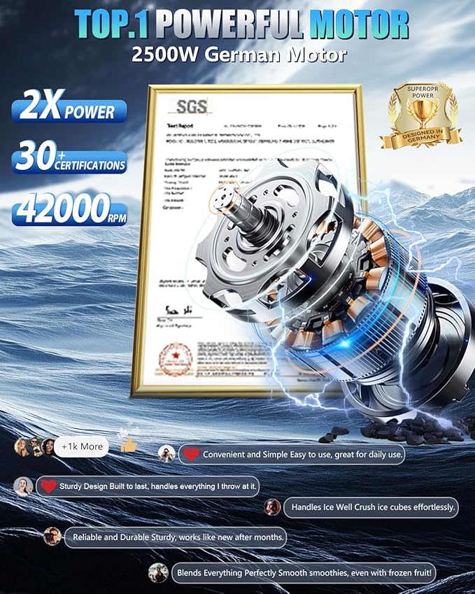 2025 Upgrade Commercial Blender | SGS German Super Motor 2500W| Dishwasher Safe | 6-Piece Japanese Blades, 3-Second Quick Ice Crushing | Quiet Blender for Juices and Smoothies -