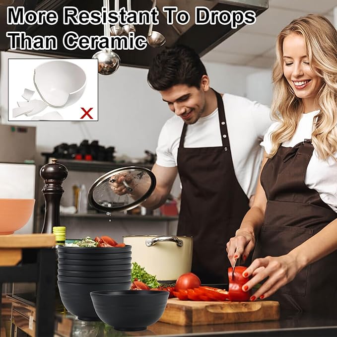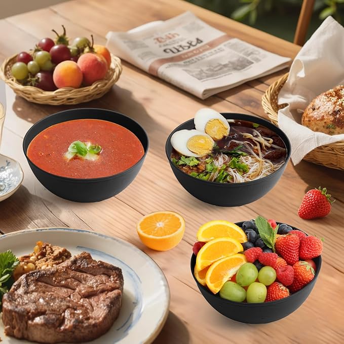 Homienly Wheat Straw Salad Bowls Set of 6, Alternative to Plastic Bowls Reusable, Microwave and Dishwasher Safe Bowl Set, 40 OZ Large Capacity for Cereal, Soup, Popcorn, Ramen, Anti-Slip Texture-Black -