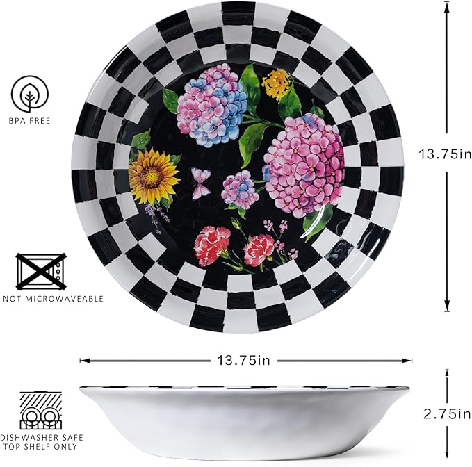LEHAHA Melamine Large Serving Bowls, Set of 2, Sunflower 13.75" x 2.75" (130 OZ) Pasta and Salad Bowl, Black Plaid Durable for Kitchen, Dishwasher Safe
