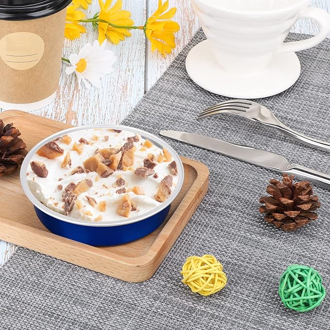 Beasea Mini Pie Pans with Lids, 4 Inch 100 Pack Disposable Cake Pans, 8 Oz Elegant Blue Aluminum Pie Pan Tin Round Disposable Tin Tart Pans Mini Cheesecake Pan for Pie Tart Quiche -