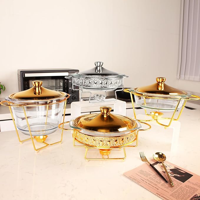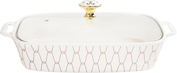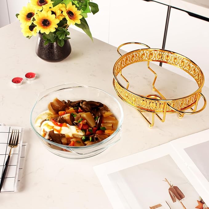 Casserole Dish 9"Glass Baking Dish with Stainless steel Lid and rack, Golden round 1.5 Qt Baking Pan For Casserole & Lasagna, Microwave Dishwasher Freezer Oven Safe -