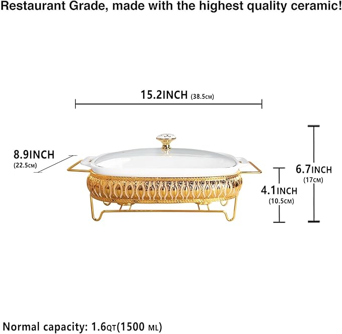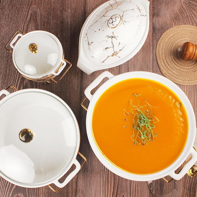 10" x 7" Ceramic Casserole Dish with Glass Lid, 1.3 QT Serving Soup Tureen,Chafing Dish for Buffet, Family Food preserve Tray, Catering Casserole for Party Style -