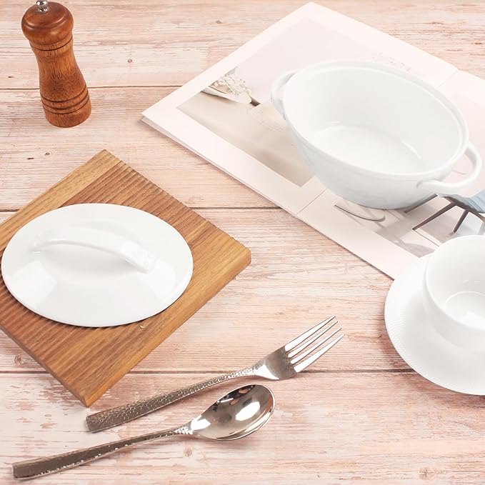11" x 8" Ceramic Casserole Dish with Glass Lid and Rack, 50 ounce Serving Soup Tureen,Chafing Dish for Buffet, Family Food preserve Tray, Catering Casserole for Party Style, White -