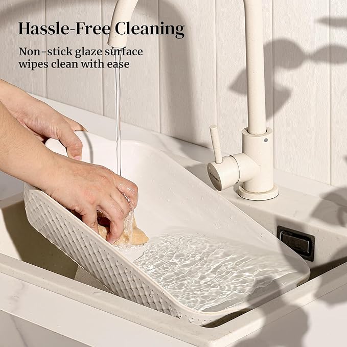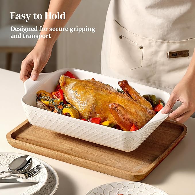 DOWAN 9x13 Deep Lasagna Baking Dish, Ceramic Casserole Dish for Oven, 4 Quarts Embossed Baking Pan with Handles, Oven Safe Bakeware for Roasting, Desserts, Durable & Giftable, Arctic White -