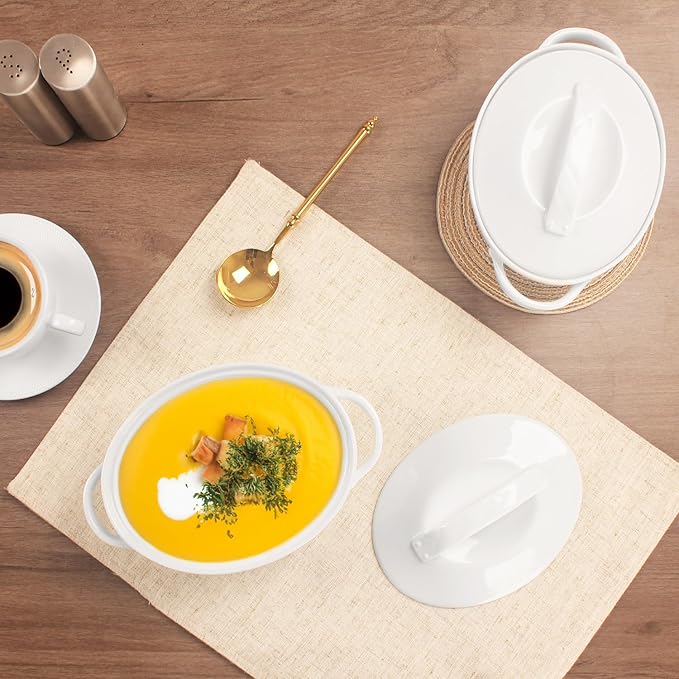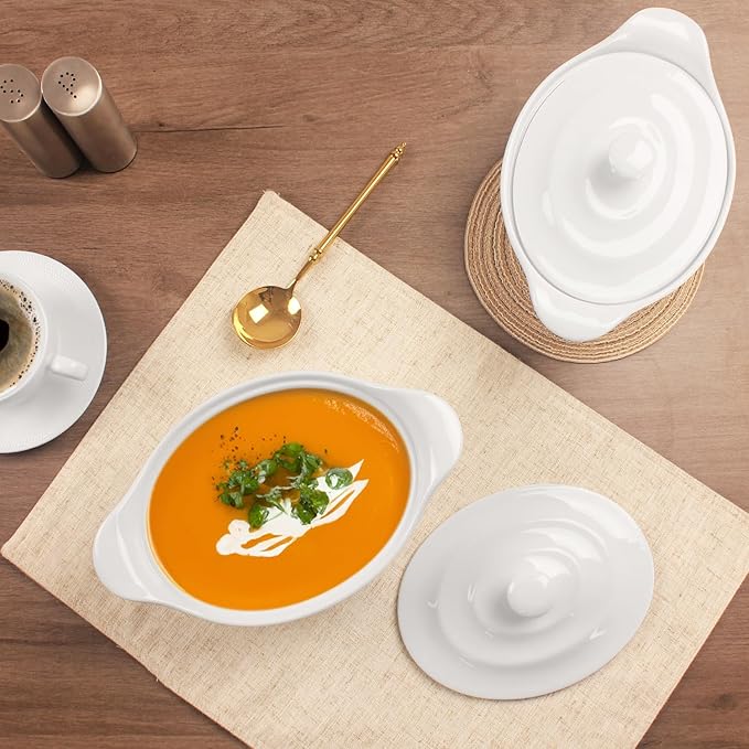 Oval Casserole Dish 23.7 oz, French Onion Soup Ceramic French Serving Soup Tureen Set, Set of 2 Ceramic Mini Cocotte Set, Baking Dish with Lids and Handles, Microwave Dishwasher Oven Safe -