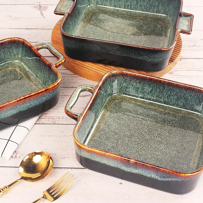 Mini Casserole Dish 23 Ounce French White Ceramic Bakeware Set with Lids, Chip and Crack Resistant Stoneware Baking Dish, Microwave, Dishwasher, Oven, Freezer and Fridge Safe (Green 7.1 -