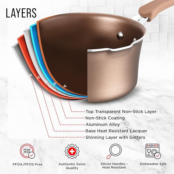 Pots and Pans Set – 14 Piece – Non-Stick Professional Home Kitchenware – Cooking Pots with Lids – Skillet Fry Pans – Suitable for Gas, Electric, Ceramic and Induction Counter Cooktops - Golden -