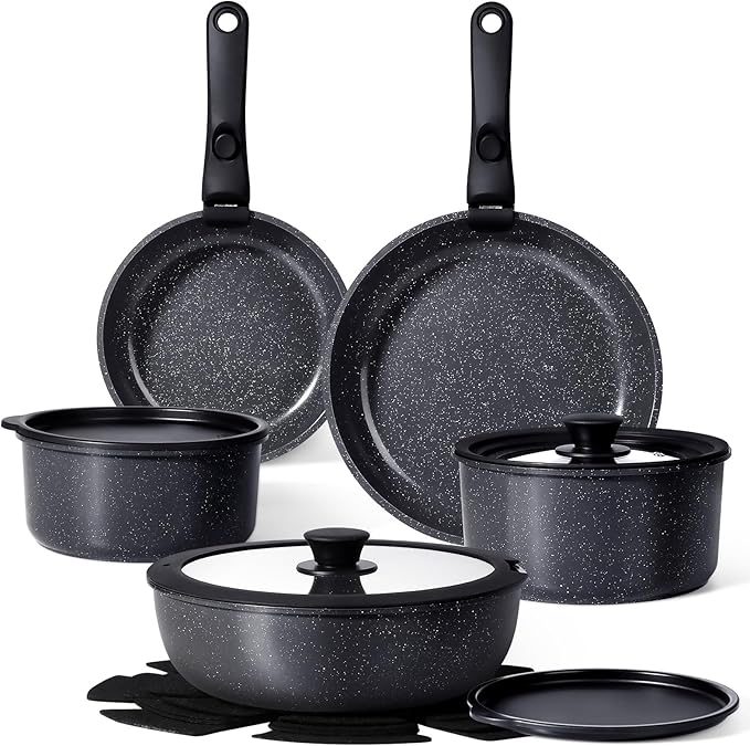 Pots & Pans Set Non Stick Ceramic-Granite – 14-Piece Cookware with Detachable Handles, Stackable Space-Saving, Dishwasher Safe, Oven & All-Stove Safe, Tempered Glass Lids, Black Granite -