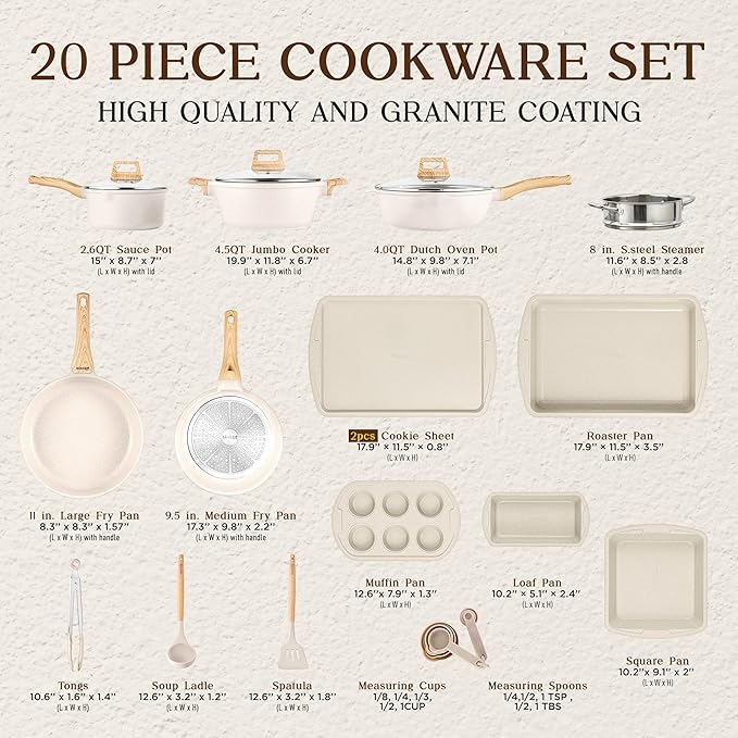 Bakken Master 20 Piece Cookware Set - Pots and Pans with Handle Grips and Tempered Glass Lids, With 6-piece Bakeware Set, Nonstick Granite Coating, Ceramic Max Temperature (Up To 500°F), Brown Marble -