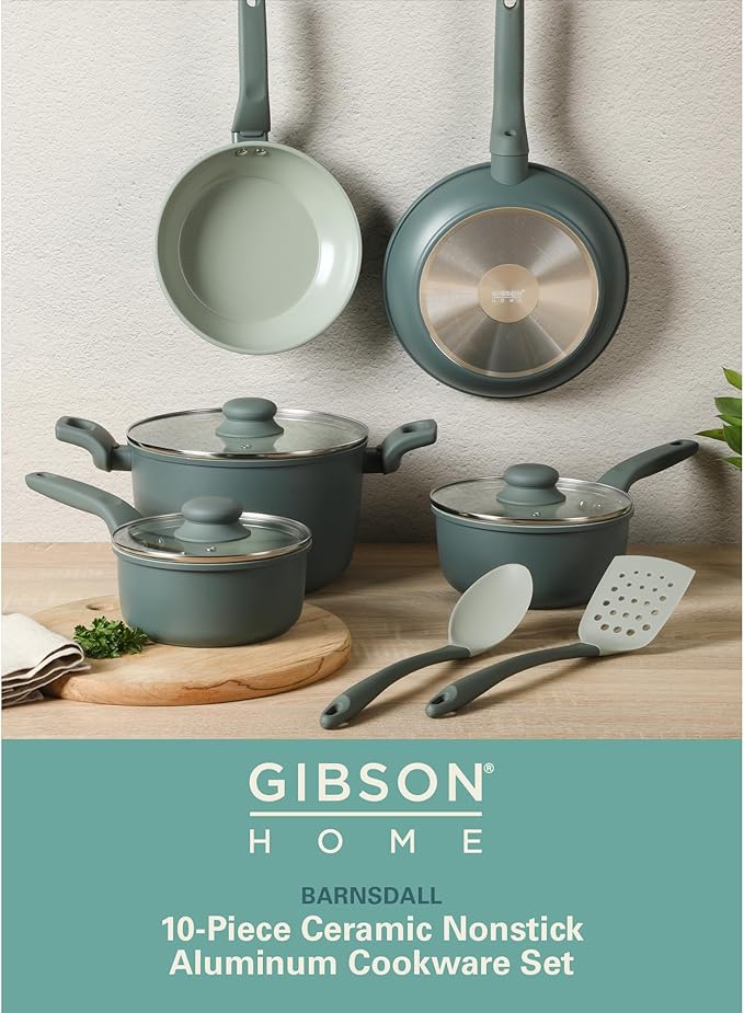 Gibson Home Barnsdall 10 Piece Premium PFA Free Ceramic Nonstick Pots and Pans Aluminum Induction Cookware Set W/Kitchen Tools - Sage Green/Grey Non Stick -