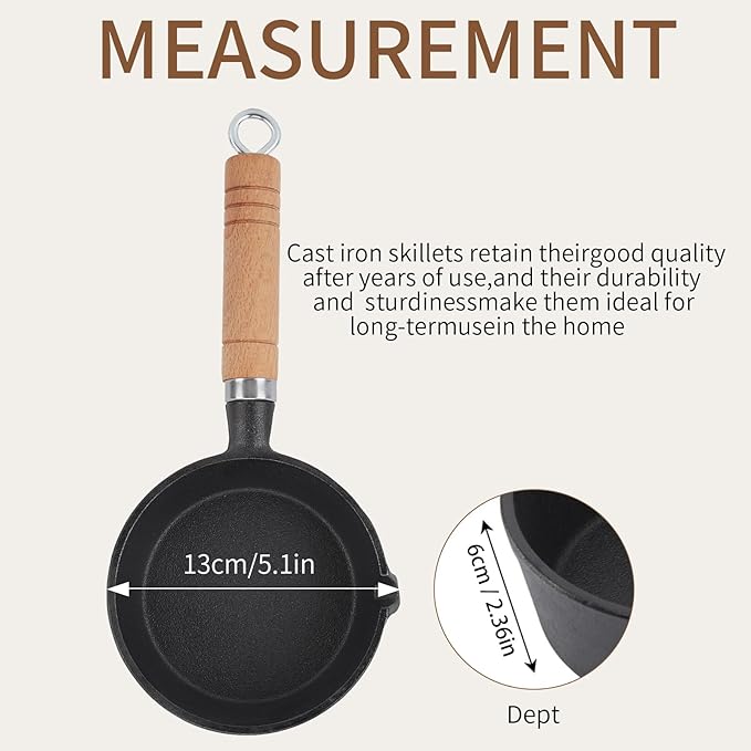 Mini Egg Frying Pan, Cast Iron Omelette Pan Skillet with Wooden Handle, Mini Pre Seasoned Skillet, Nonstick Egg and Fry Cast Iron Pot for Indoor Outdoor Cooking(13x5cm / 5.1x2.0in) -