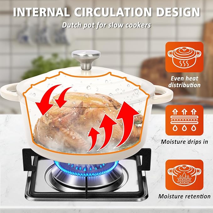 Hisencn Enameled Cast Iron Cookware Set - 7-Piece Ceramic Coated Cast Iron Cookware Set, Dutch Ovens, Sauce Pan, Skillet, 3 Lids, Heavy Duty Cookware, Gas/Induction Compatible, PFA Free, Cream White -