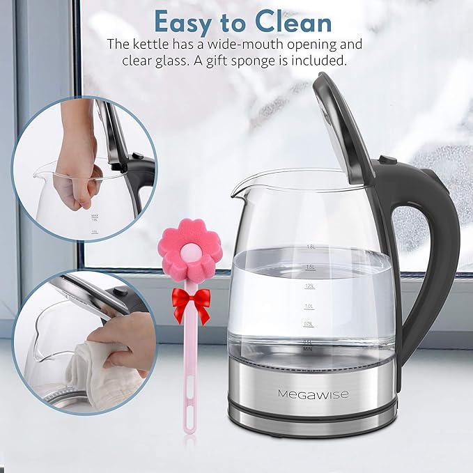 MegaWise Electric Kettle, 1.8L Borosilicate Glass Tea Kettle with LED Light, Auto Shut-Off and Boil-Dry Protection Cordless Kettle Fast Boiling -