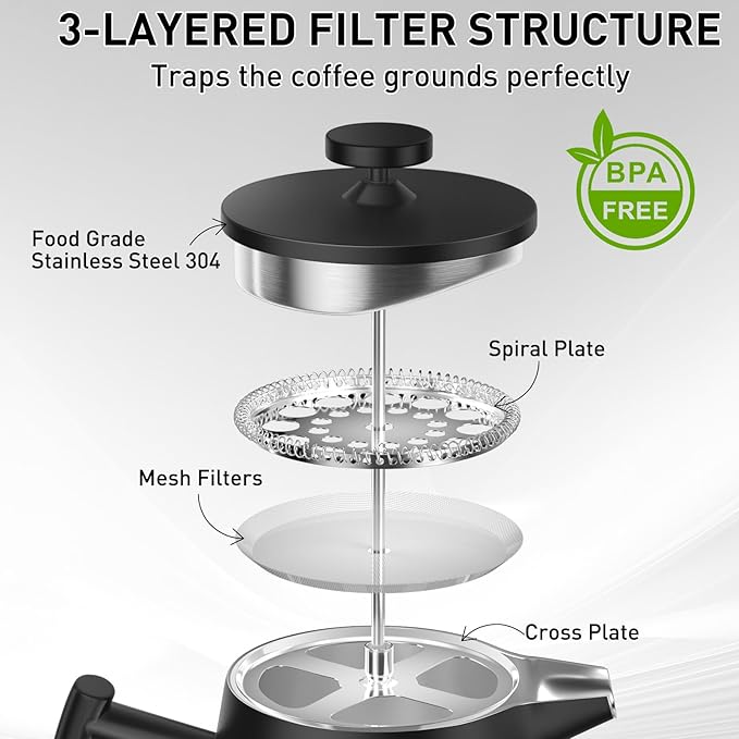 Miuly 21OZ French Press Coffee Maker 600ML Stainless Steel Coffee Press with 3 Level Filtration System, Double Wall Insulated French Press with 2 Filters -