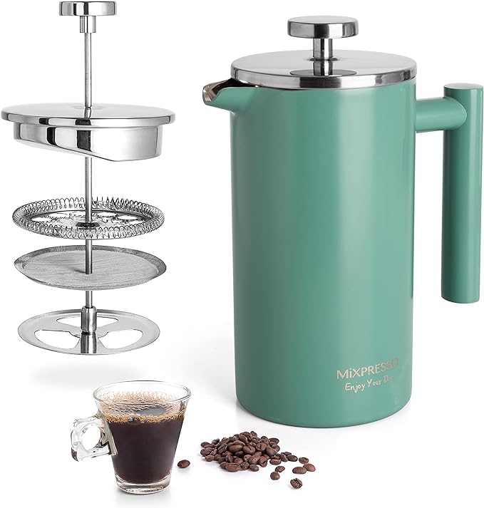 Mixpresso Green Stainless Steel French Press Coffee Maker 26 Oz 770 Ml, Double Wall Insulated French Press Stainless Steel, Easy Clean Tea Brewer, Easy Press Durable Metal Coffee Press -