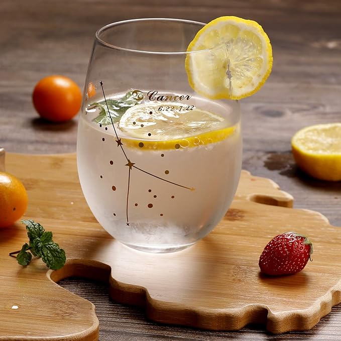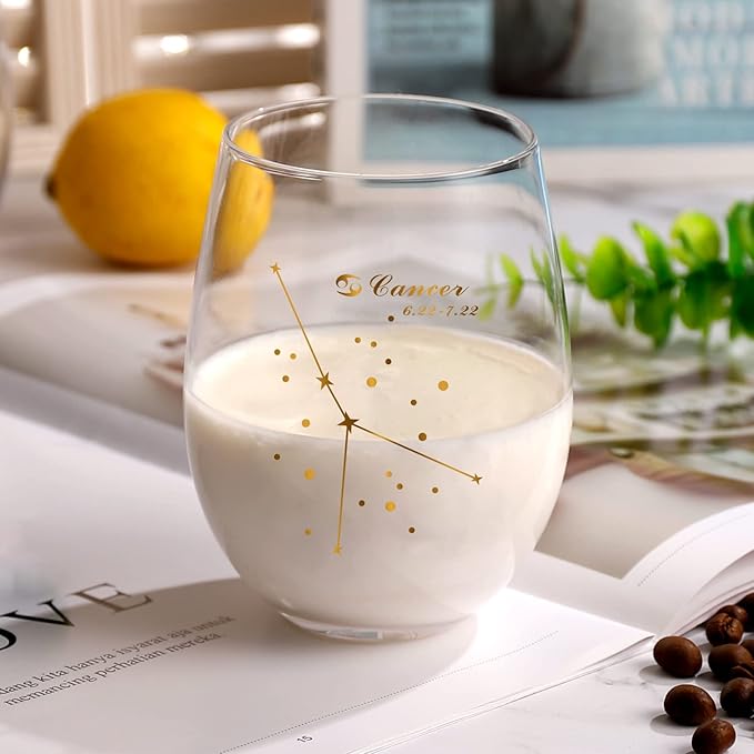 HOHY Cancer Stemless Wine Glass 20 Oz, Cancer Constellation Wine Glass Golden, Zodiac Gifts June Birthday Gifts for Women -