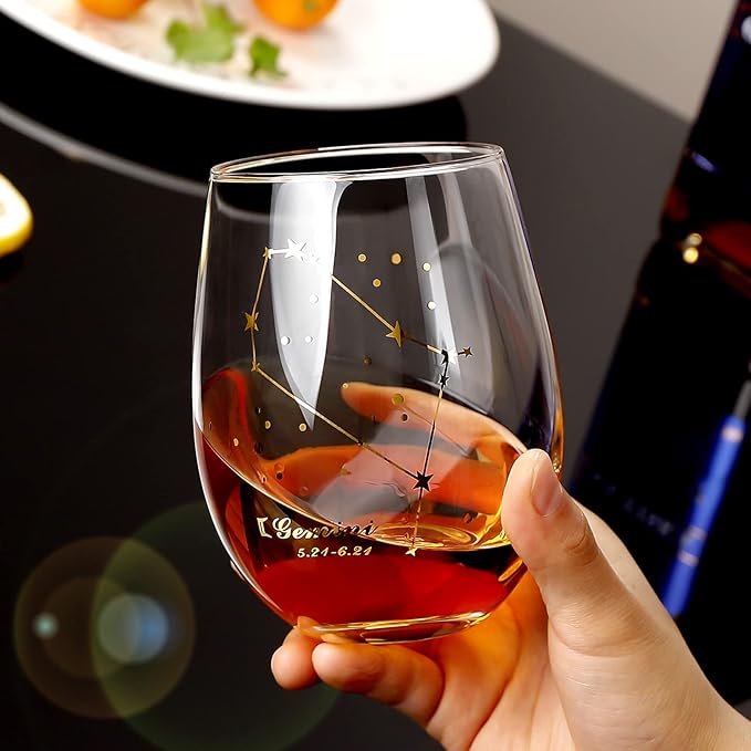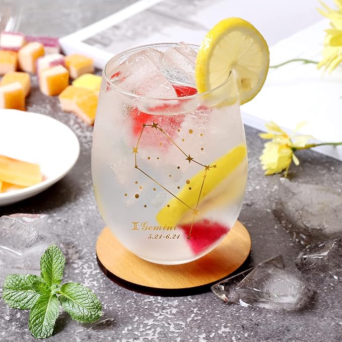 HOHY Gemini Stemless Wine Glass - 20 Oz, Constellation Design, Astrology Zodiac Gift for June Birthday Women -