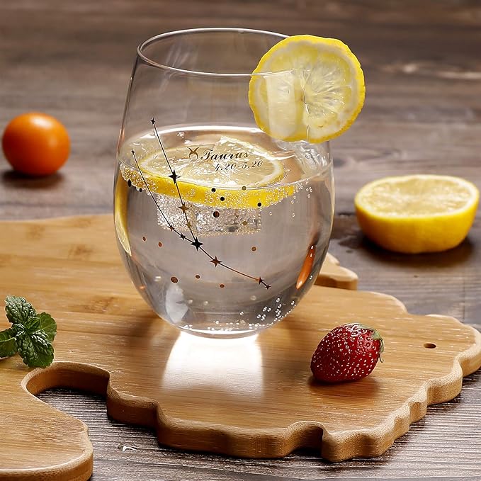 Taurus Stemless Wine Glass 20 Oz - Zodiac Birthday Gifts for Women Men, Golden Cup, Constellation Tumbler, Astrology Gift -