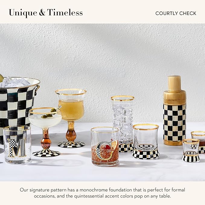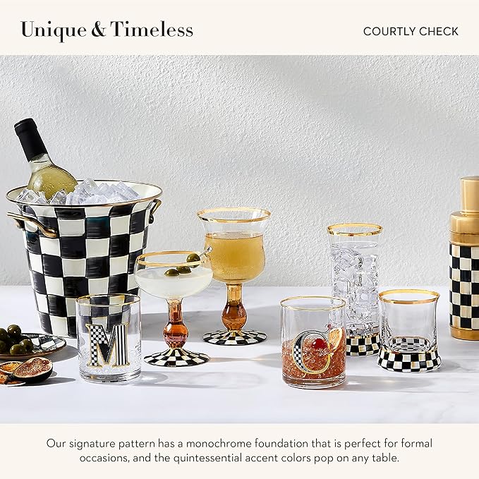 MACKENZIE-CHILDS Highball Glasses, Tall Drinking Glasses with Gold Rims, 15 Ounces, Set of 2, Gray-and-White Sterling Check -