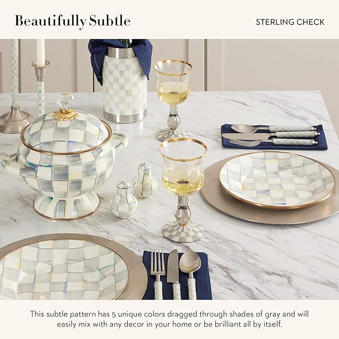 MACKENZIE-CHILDS Stemmed Wine Glass, Decorative Wine Glassware, 16 Ounces, Gray-and-White Sterling Check -