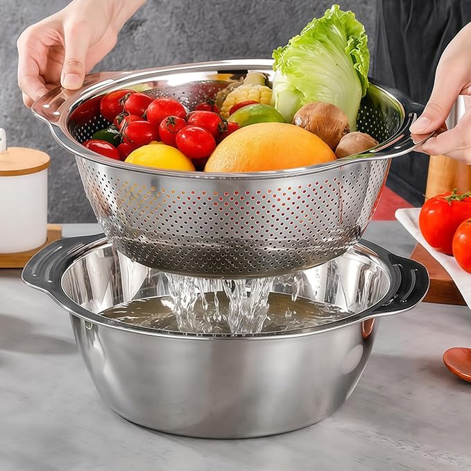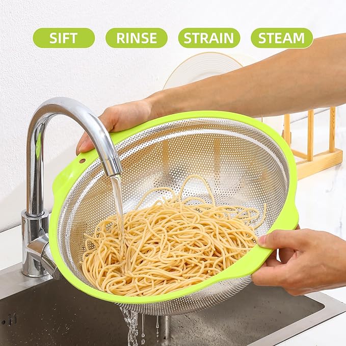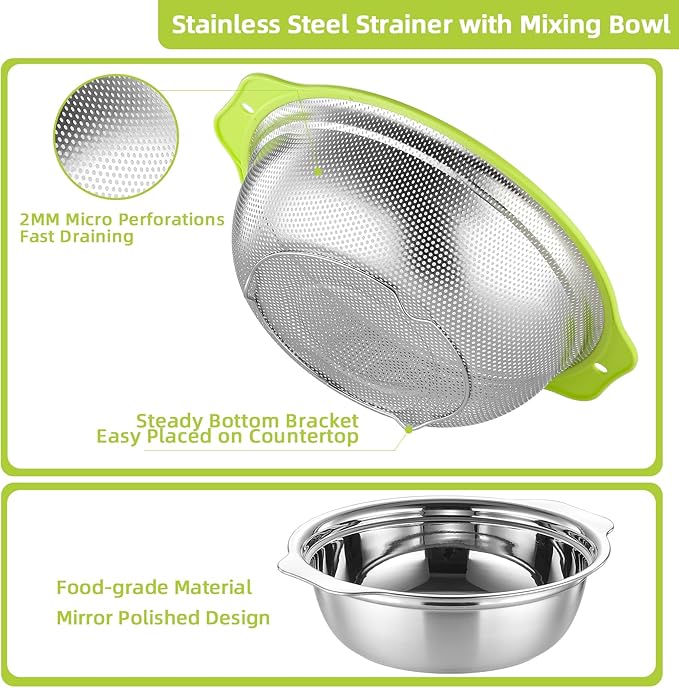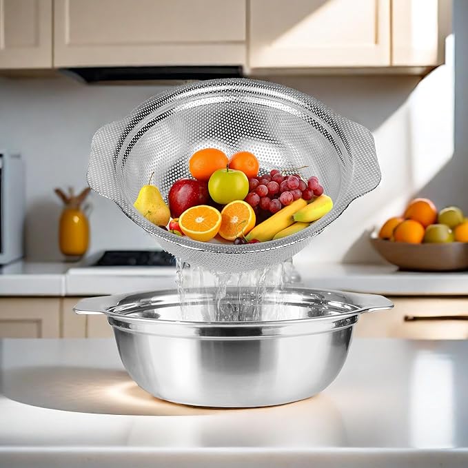 Versatile 3.5 Quart Kitchen Colander Set with Handle, Micro-Perforated Strainer for Pasta, Rice, Vegetables, Fruits, Heated 18/10 Stainless Steel Mixing Bowl for Salad, Cooking, Baking -