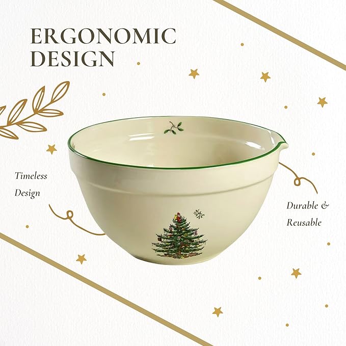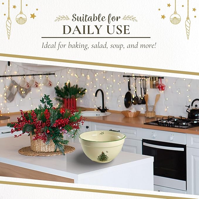 Spode Christmas Tree Mixing Bowl with Spout, 2-Quart Batter Bowl with Pour Spout, Measures 9-Inches, Holiday Serving Dishes, Dishwasher and Microwave Safe -