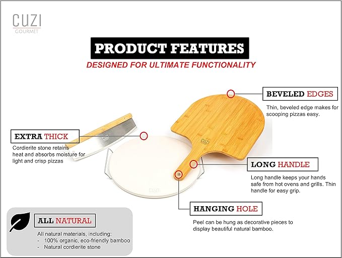 Cuzi Gourmet 4-Piece Large Pizza Stone Set - 13" Thermal Shock Resistant Cordierite Pizza Stone with Handle Rack, 19" Natural Bamboo Pizza Peel & Pizza Cutter - Large Baking Stone for Grill and Oven -