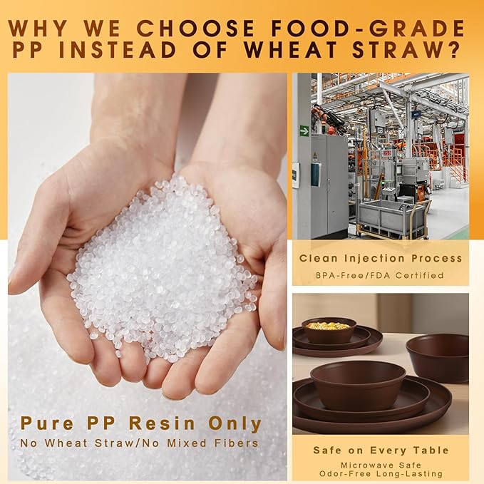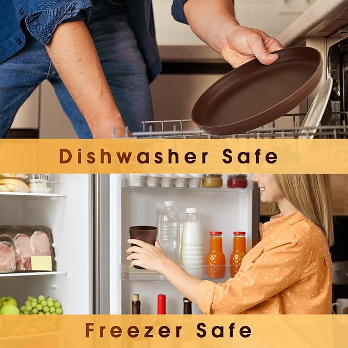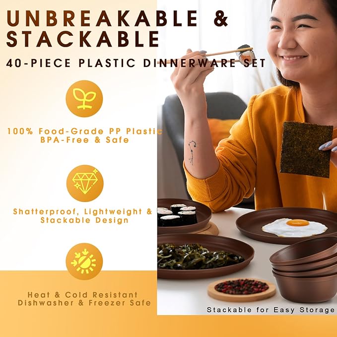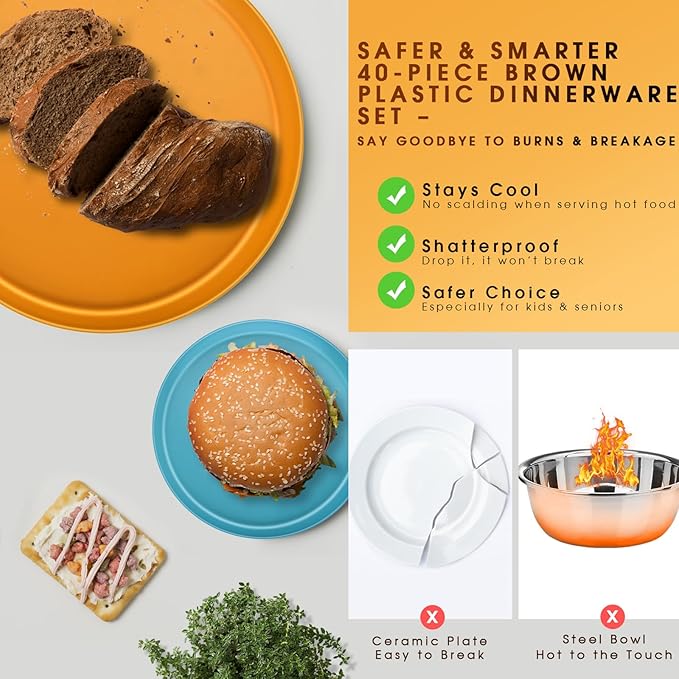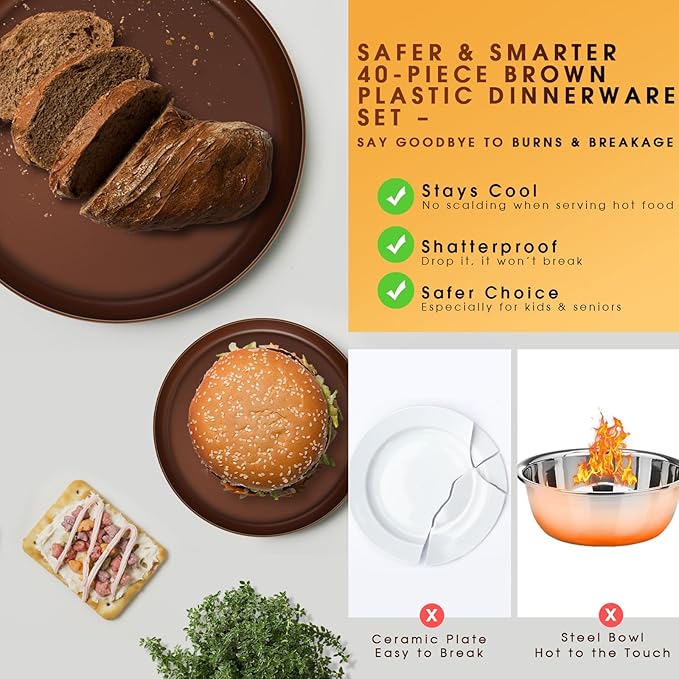 Plastic Dinnerware Sets – Brown Plastic Plates, 40-Piece Reusable Dishes Set for 8 with Cups, Forks, Knives and Spoons, Unbreakable Plates and Bowls for Camping, Outdoor Use -