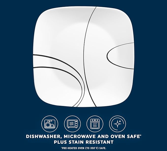 Corelle 18-Piece Service for 6 Dinnerware Set Triple Layer Glass and Chip Resistant, Lightweight Square Plates and Bowls Set, Simple Lines -