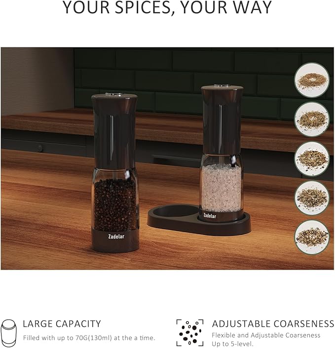 Electric Salt and Pepper Grinder Set - Battery Operated Stainless Steel Mills (1 Black Pepper Grinder + 1 White Salt Grinder) Automatic One Handed Operation Electronic Adjustable Ceramic Grinders -