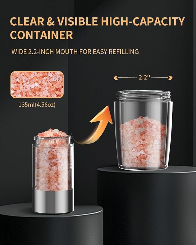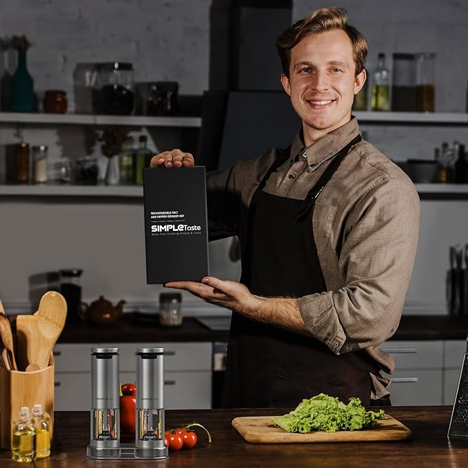 SIMPLETASTE Electric Salt and Pepper Grinder Set Rechargeable with LED Light, Stainless Steel, 70g Capacity for Kitchen, Dining Room, Bar -