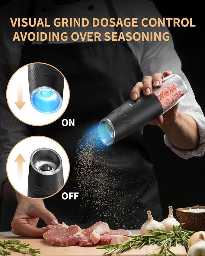AmuseWit Gravity Electric Salt and Pepper Grinder Set of 2 [White Light] Battery Operated Automatic Pepper and Salt Mills with Light,Adjustable Coarseness,One Handed Operation,Black