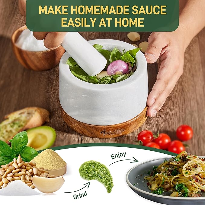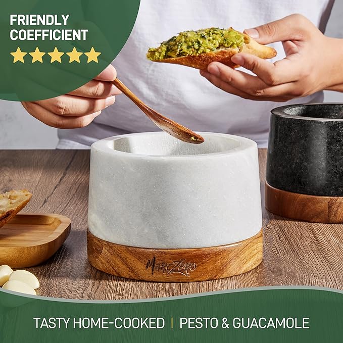 MarcZero 6inch Large Mortar and Pestle Set with Anti-Scratch Wooden Base, Heavy Duty Mortar and Pestle Made of Natural Marble(White) -