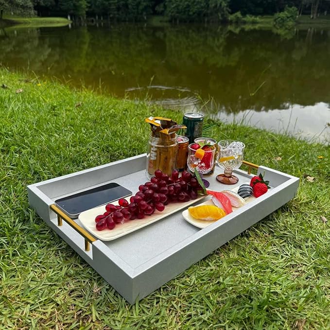 14x20 Inches Silver Faux Leather Wrapped Wood Serving Tray with Metal Handles for Various Occasions, Ottoman, Home Decor Decorative, Living Room, Coffee Table Organizer, Serving Breakfast On Bed -