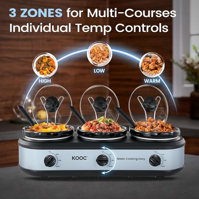 KOOC Triple Slow Cooker Buffet Server and Food Warmer 3x1.5 Quart Individual Temp Control With Lid Rests & Spoons With Liners Included Blue Grey -