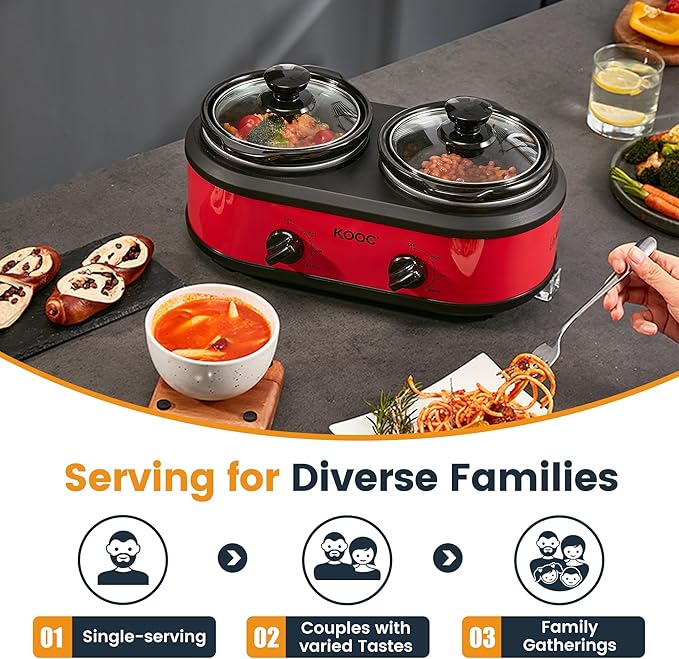 KOOC Double Small Slow Cooker, Buffet Server and Warmer, 2 Mini Pots with 3 Individual Adjustable Temp, Dual Ceramic Pots, Free Liners for Easy Clean-up, Stainless Steel, Total 2.5 Quart, Red, Round -