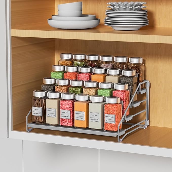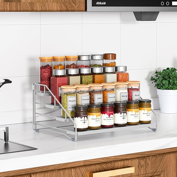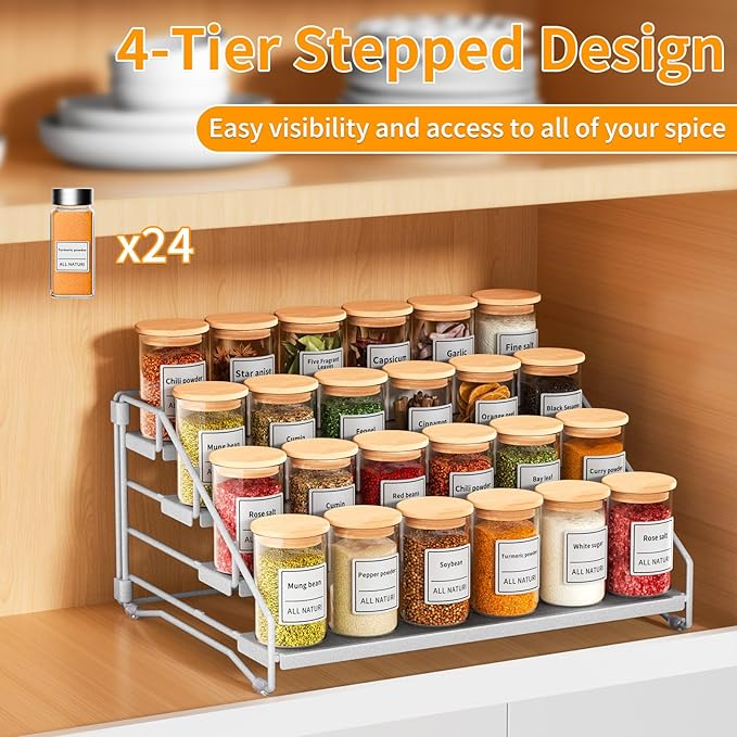 RCHYFEED 4 Tier Spice Rack Organizer, Spice Organization for Cabinet,Pantry, Countertop,Tiered Spice Rack Easy Visibility,Depth Expandable Seasoning Shelf for Kitchen Cabinet Organizer,Silver -