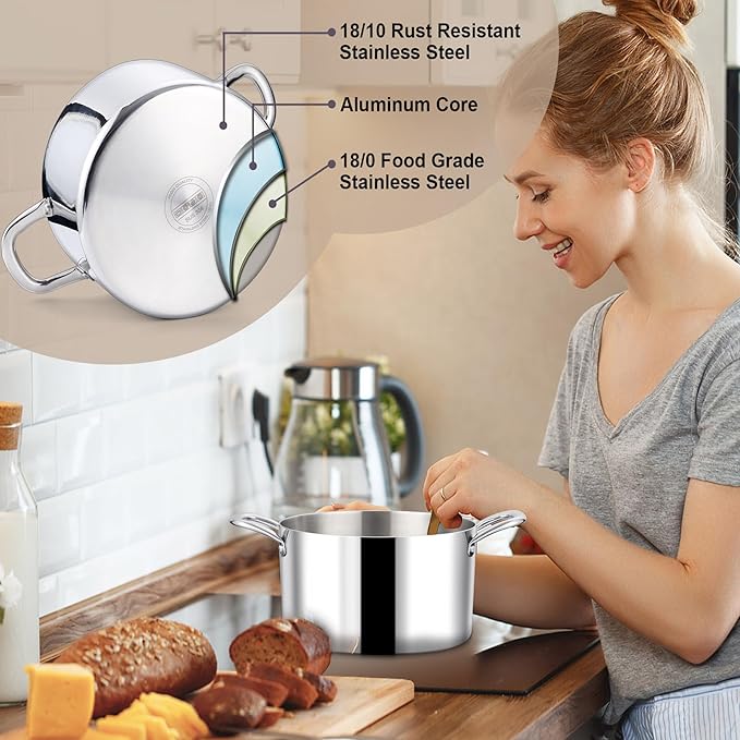 BEZIA 6 Quart Tri-Ply Stainless Steel Stockpot,Even Heat Distribution, Cooking Pot With Sturdy Handles, Oven-Safe Up to 500°F, Compatible with All Cooktops, Perfect for Soups & Stews, Silver -