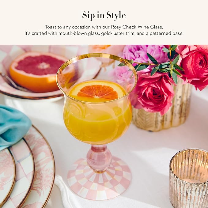 MACKENZIE-CHILDS Stemmed Wine Glass, Decorative Wine Glassware, 16 Ounces, Pink-and-White Rosy Check -