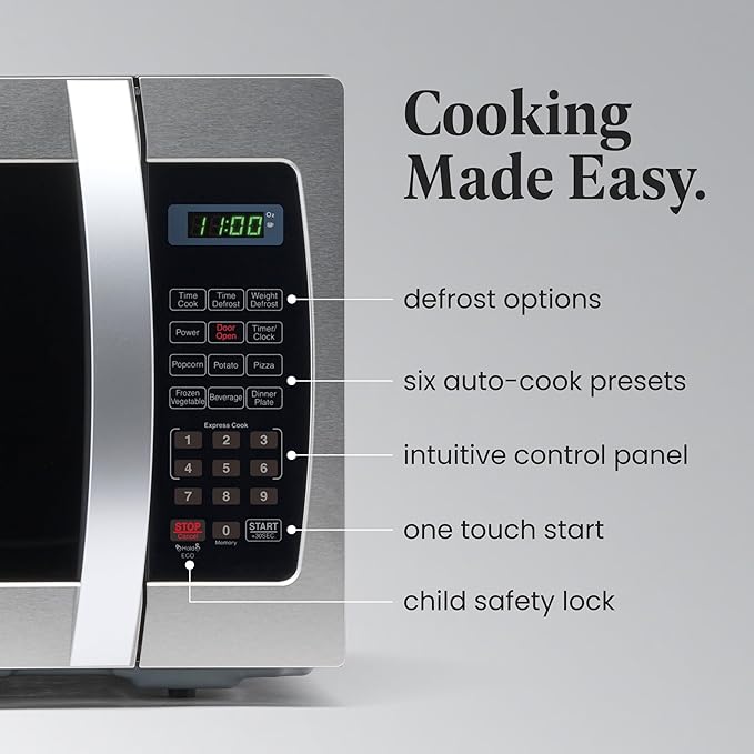 • ALL YOU NEED: This microwave has a clear LED display with a kitchen timer and clock that lets you easily keep track of time. Easy-to-view interior lighting lets you keep an eye on your dish, and a child safety lock adds additional security.