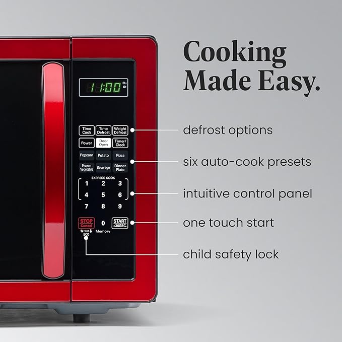 • ALL YOU NEED: This microwave has a clear LED display with a kitchen timer and clock that lets you easily keep track of time. Easy-to-view interior lighting lets you keep an eye on your dish, and a child safety lock adds additional security.