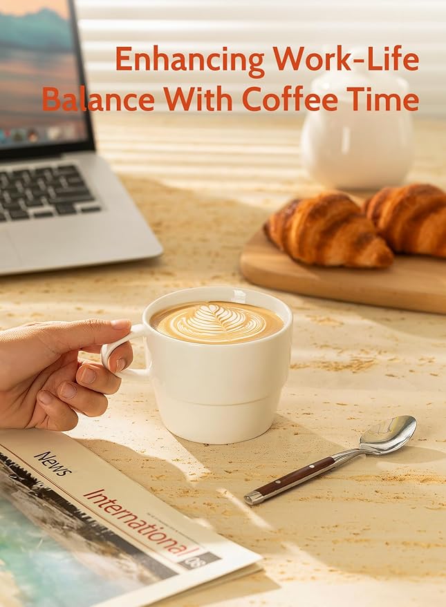 Sweese 6-Pack Porcelain Latte Cups - Stackable 10 Ounce Coffee Mugs for Cappuccino, Mocha, Tea - Space-Saving, Chip-Resistant - Dishwasher Friendly – Ideal for Home and Café, White